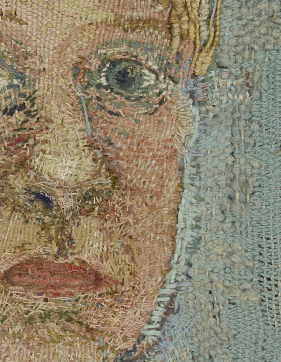 Margaret Sunday, Self-portrait with novelty hat (detail) improvisational tapestry techniques: flax, cotton, wool, silk, bamboo and synthetic fibers, silk and synthetic ribbon, Margaret Sunday, 2015