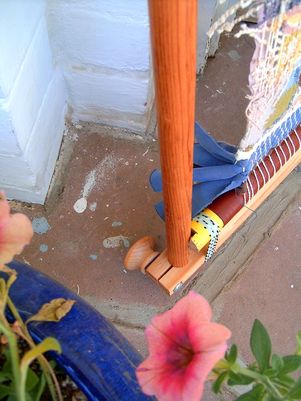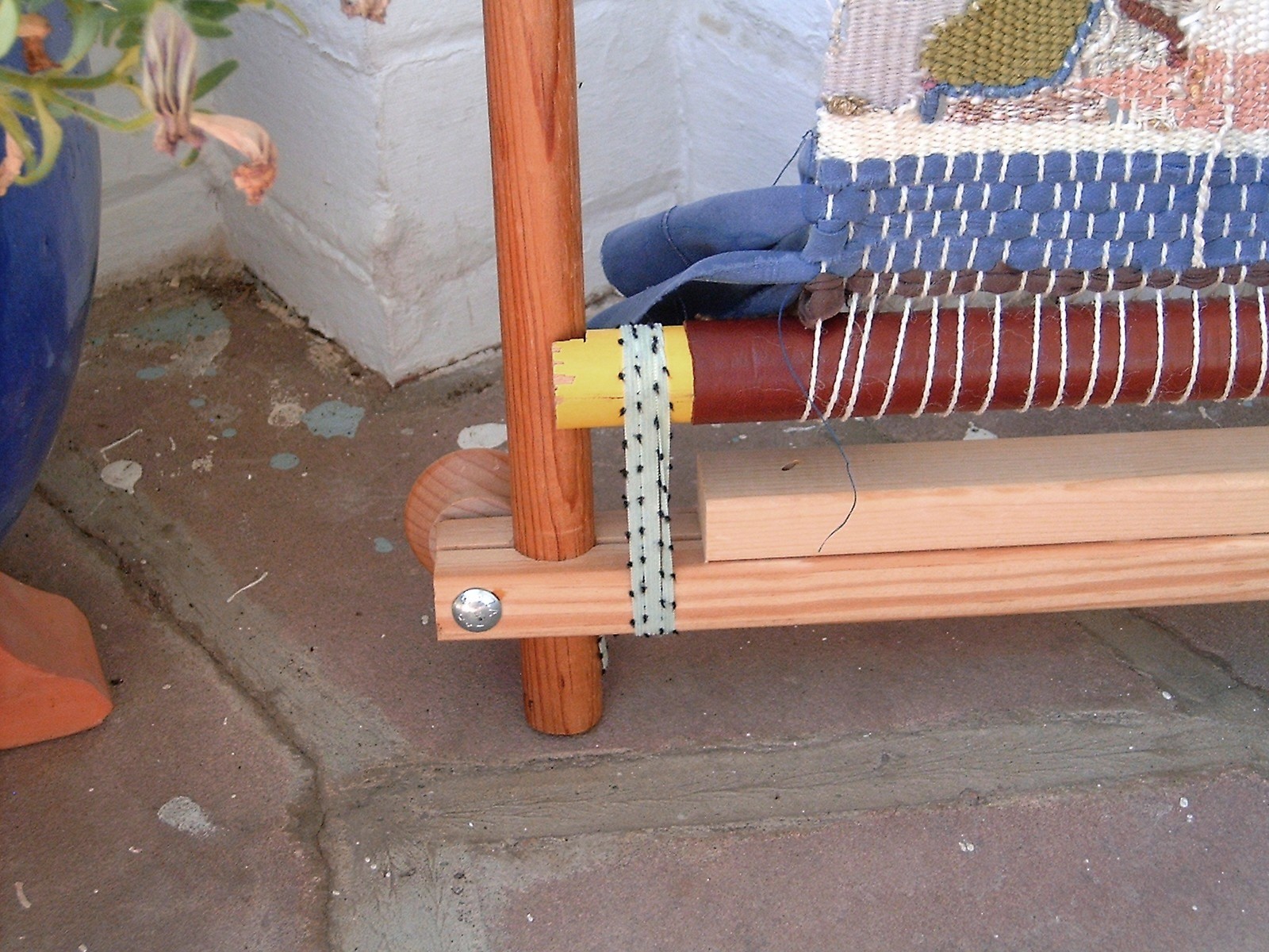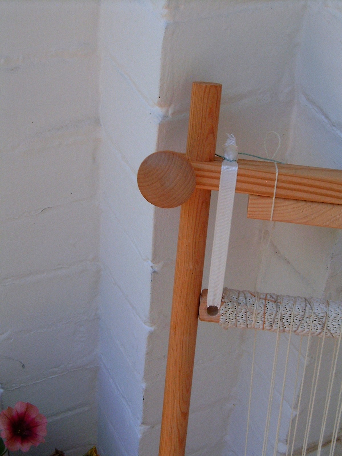 • example shown in the photos My frame loom was purchased at a craft store. I think it was intended for stretching needlework, or for a child’s use. I chose it because it is made of large wooden dowels, and the metal bolts and nuts that secure the corners are counter-sunk into the frame (no snags, nicer to handle and easier on the table top). The wooden knobs, which cover the nut heads from the back, act as feet when the loom is horizontal, and make tightening the nuts when tensioning easier.