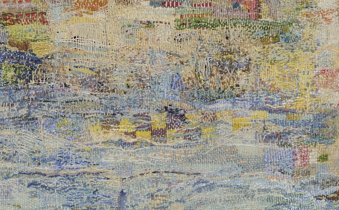 My tapestries are small in format and bas-relief, hanging flat against the wall. My repertoire of improvisational tapestry techniques includes supplemental warps (and wefts) on- and off-loom; layering, tacketing, piecing, strips and needleplay with mixed natural and synthetic threads, pre-woven fabrics and silk ribbon. The works can be described as delicate, fine, “painterly”, colorist, organic, spontaneous, intensively worked and craft-conscious. Their imagery is often non-objective with references to the experiences of motion and memory in landscape.